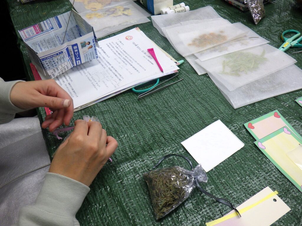 『花に親しむ講習会』と題して、ハーブの香り袋や押し花を使い、花飾りを作る講習会を開催しました。