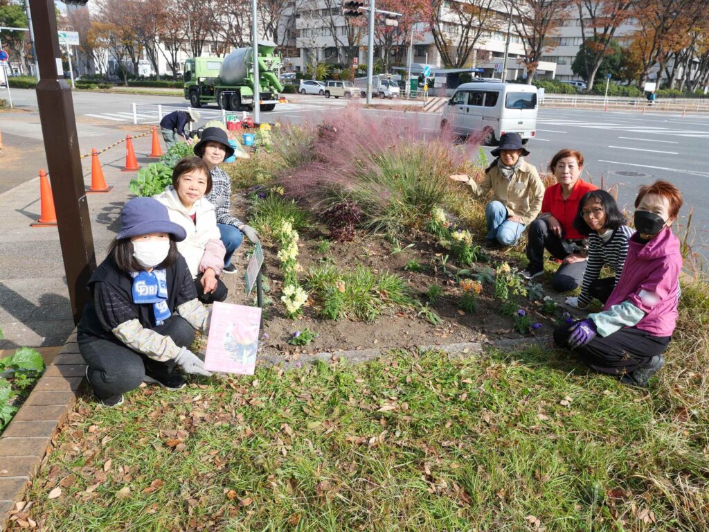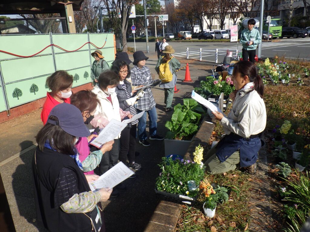 市役所交差点にある「花の環花だん」で12/2(火)に花の環フレンド対象の“冬の花植え講習会”をなごや花の環ネット事務局が講師となって開催しました。