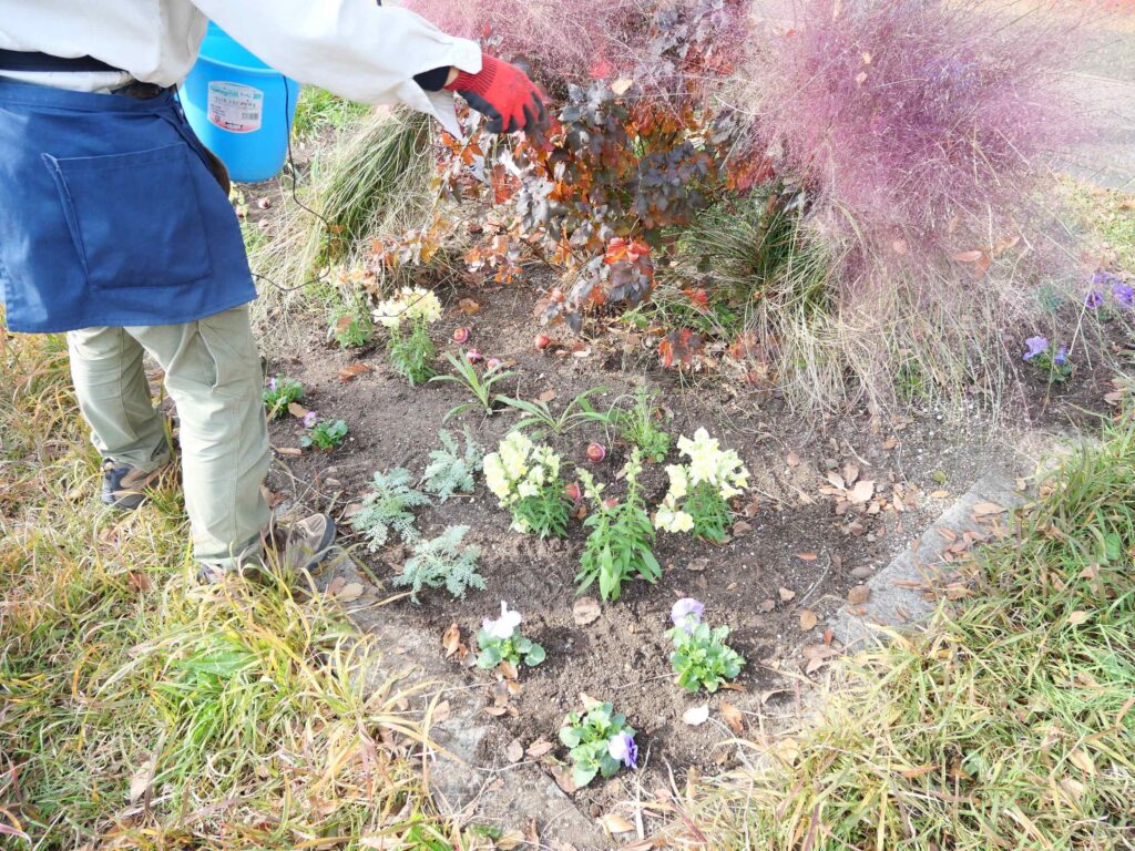 冬から春にかけて咲くおすすめの植物の紹介をした後、3つの花壇に分かれて植栽をしていきます。