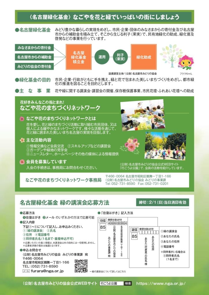 名古屋市内の公園・庭園ガイド「行こうよ公園」> 催し物・講習会>令和8年3月8日 名古屋緑化基金「緑の講演会」